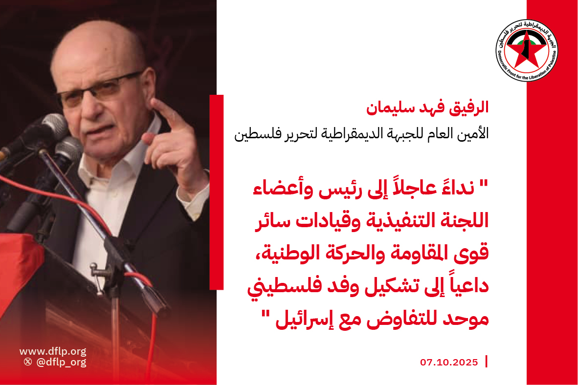 أطلق الرفيق فهد سليمان، الأمين العام للجبهة الديمقراطية لتحرير فلسطين ، نداءً عاجلاً إلى رئيس وأعضاء اللجنة التنفيذية وقيادات سائر قوى المقاومة والحركة الوطنية، داعياً إلى تشكيل وفد فلسطيني موحد للتفاوض مع إسرائيل.