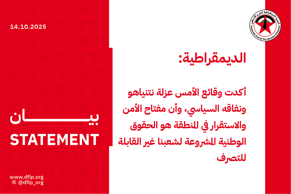 واختتمت الجبهة الديمقراطية تعليقاتها على وقائع الإثنين في 13/10/2025، بالتأكيد أن شعبنا الذي قطع شوطاً شديد الأهمية في معركة الدفاع عن وطنه، خلال العامين من النضال الأسطوري، سيواصل مساره النضالي دون تردد أو إبطاء، وصولاً إلى تحقيق الأهداف المنشودة، دوماً تحت راية م. ت. ف. ممثله الشرعي والوحيد، وفي ظل وحدة ميدانية تعزز مكانته الدولية وقدارته على مراكمة الإيجابيات