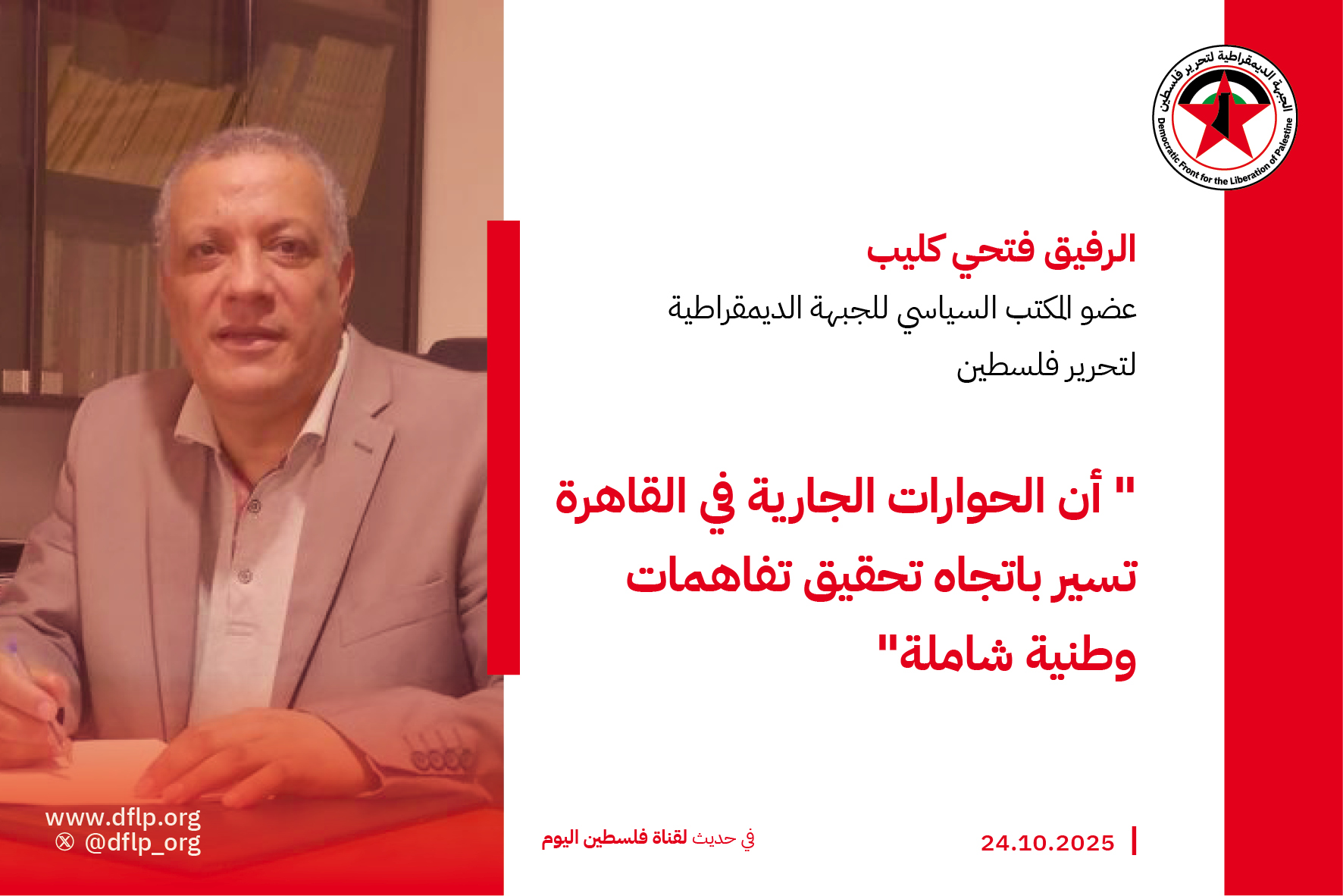 القاهرة، أكد الرفيق فتحي كليب عضو المكتب السياسي للجبهة الديمقراطية لتحرير فلسطين، خلال مقابلة مع قناة فلسطين اليوم أبرز ما جاء فيها: