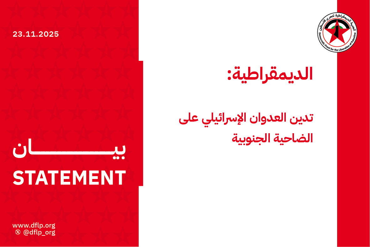 ودعت الجبهة الديمقراطية إلى اتخاذ خطوات فاعلة لردع الاحتلال وإجباره على وقف ممارساته العدوانية، والعمل الجاد على حماية شعوب المنطقة من التهديدات المستمرة.