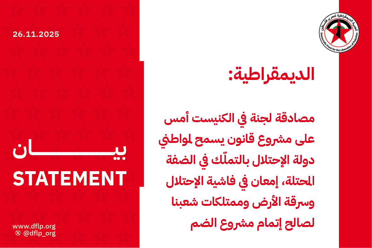 وأكملت الجبهة الديمقراطية: إن مشروع القرار هذا يأتي في سياق مشاريع عدة يناقشها برلمان الإحتلال وهي باطلة من وجهة نظر القانون الدولي، كقانون فرض السيادة على الضفة وقانون إعدام الأسرى الفلسطينيين، كلها قوانين فاشية تأتي في سياق سعي الإحتلال المحموم لفرض وقائع جديدة على الأرض تحول دون قيام دولة فلسطينية وإتمام مشروع الضم، ورداً على موجة الإعترافات العالمية بدولة فلسطين، وحتى على قرار مجلس الأمن الأخير رقم 2803 وما تضمنه من وعد واهي (بالمسار الموثوق نحو تقرير المصير والدولة)، كل مشاريع القرارات هذه تأتي أيضاً انتقاماً من صمود شعبنا والتحول في الرأي العام الدولي لصالح شعبنا ونضاله وحقوقه، بعد أكثر من عامين على صموده في وجه حرب الإبادة في غزة والتطهير العرقي في الضفة.