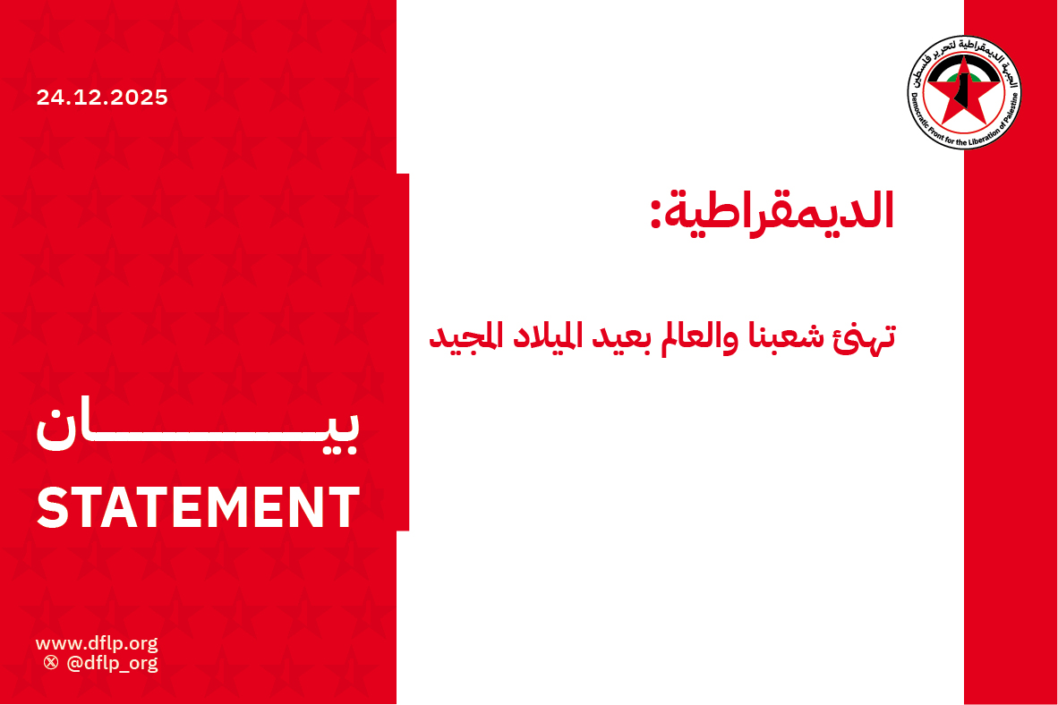 تتقدم الجبهة الديمقراطية لتحرير فلسطين من شعبنا الفلسطيني في كافة أماكن وجوده ومن العالم، بأصدق التهاني بحلول عيد الميلاد المجيد، متمنية للجميع الصحة والعافية والأمن والاستقرار والمستقبل الزاهر.