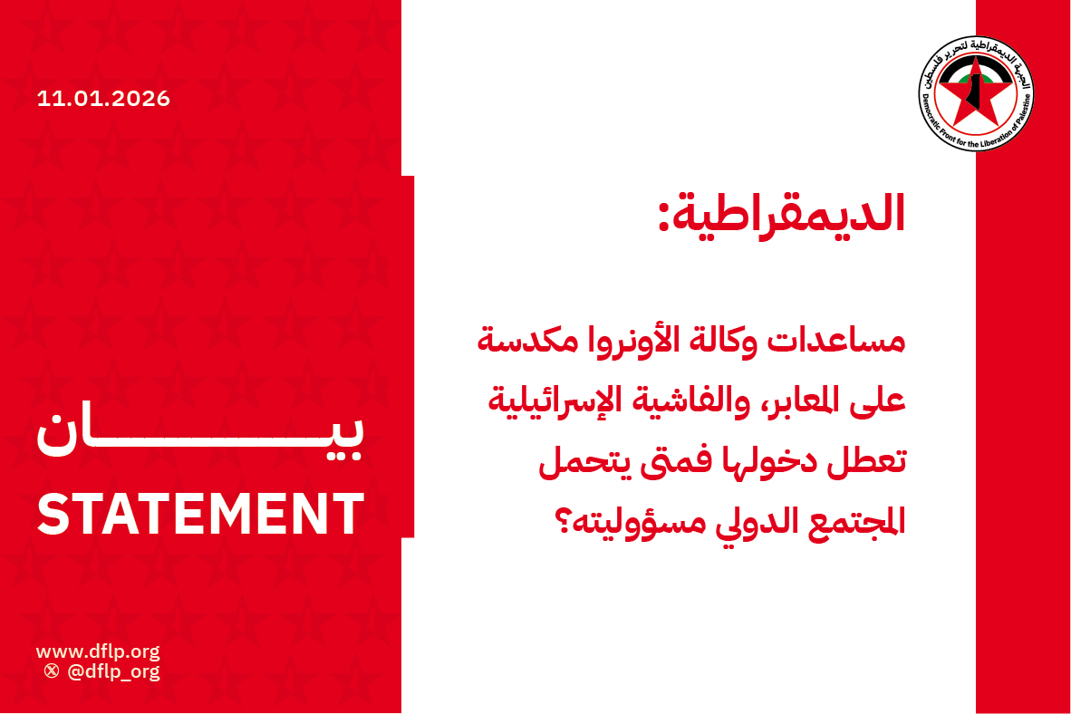 تساءلت الجبهة الديمقراطية لتحرير فلسطين متى سوف يتحمل المجتمع الدولي مسؤوليته الإنسانية، والأخلاقية والقانونية، أمام أوضاع شعبنا في قطاع غزة، التي تزداد تدهوراً ومأساوية، وهو يمنع دخول مواد المساعدات الإنسانية، بما فيها المنازل الجاهزة، والخيم والشوادر المتينة، والأدوية والماء والغذاء، في وقت يتساقط فيه أبناء شعبنا من أطفال ونساء، ضحايا البرد والريح والمطر وتقلبات المناخ، آلة القتل الإسرائيلية التي لم تتوقف إلى جانب سوء التغذية والمعاناة المأساوية.
