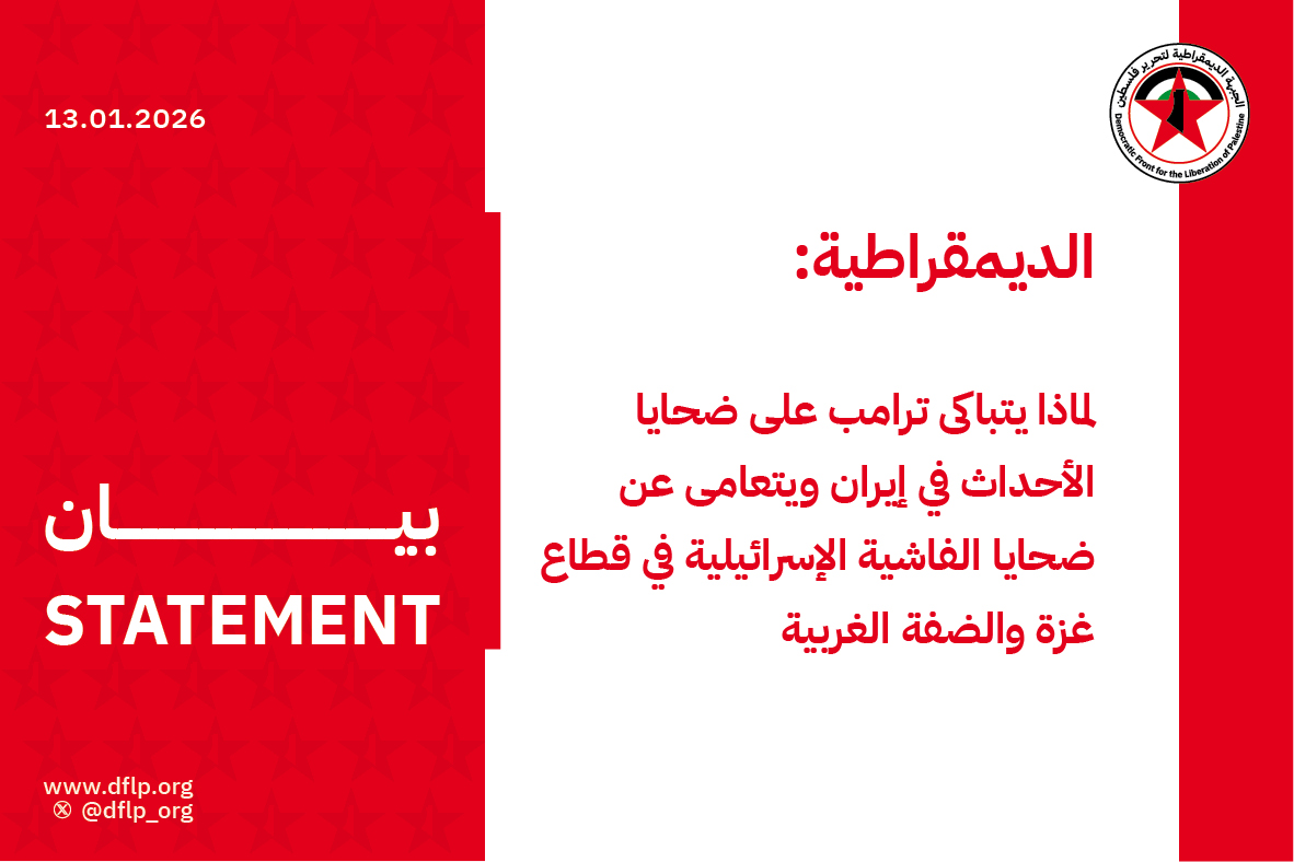 تساءلت الجبهة الديمقراطية لتحرير فلسطين في بيان لها، عن السبب الذي يدعو رئيس الإدارة الأميركية دونالد ترامب، للتباكي على ضحايا الأحداث في إيران، ويتعامى في الوقت نفسه عن الضحايا الذين يسقطون يومياً بنيران قوات الاحتلال والمستوطنين في قطاع غزة والضفة الغربية، ولماذا يهدد (كما أعلن) عن رغبته في التدخل في إيران، مقابل الصمت عن الأوضاع الدموية والمأساوية التي يعيشها شعبنا في الأرض المحتلة، ضحايا المسيرات والمدافع والقتل بدم بارد، ومنع دخول المساعدات إلى الجوعى والمهددين بالموت، وإبقاء أكثر من مليون نازح، معظمهم من الأطفال والنساء، في مهب الريح في العراء، يعانون البرد ويتلقون أمطار الشتاء بملابسهم البالية.