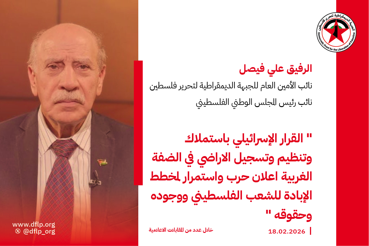 ادان الرفيق علي فيصل نائب رئيس المجلس الوطني الفلسطيني نائب الأمين العام للجبهة الديمقراطية لتحرير فلسطين، قرار الحكومة الإسرائيلية بإعادة تنظيم واستملاك وتسجيل الأراضي في الضفة الغربية واعتبره اعلان حرب واستمرار لمخطط الإبادة للشعب الفلسطيني ووجوده وحقوقه، خلال عدد تصريحات إعلامية أبرز ما جاء فيها: