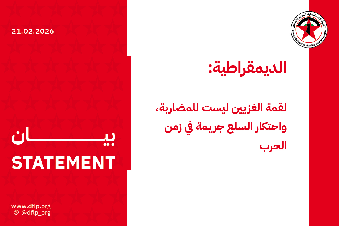 وشددت الجبهة الديمقراطية على أن استمرار هذا النهج سيقابل بموقف شعبي ووطني حازم، مؤكدة أن حماية المواطنين من جشع المحتكرين تقع في صلب مسؤوليات الجهات المختصة، التي دعتها إلى التحرك الفوري لتشديد الرقابة على الأسواق، ومصادرة السلع المحتكرة، وفرض عقوبات رادعة بحق كل من يثبت تورطه في رفع الأسعار أو تخزين البضائع بغرض المضاربة وتحقيق أرباح غير مشروعة.