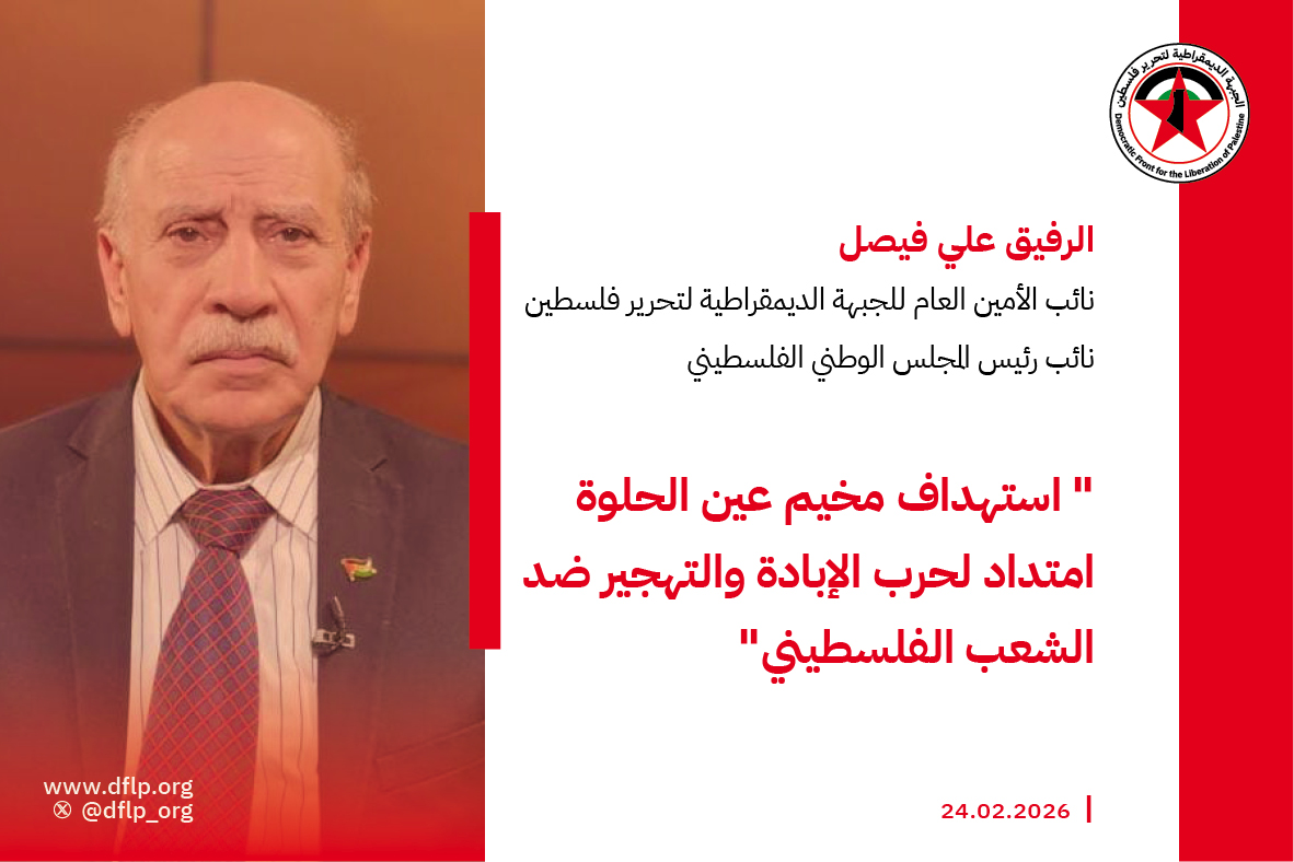 ادان الرفيق علي فيصل نائب رئيس المجلس الوطني الفلسطيني نائب الأمين العام للجبهة الديمقراطية لتحرير فلسطين، الاعتداء الإسرائيلي على مخيم عين الحلوة في لبنان، معتبرًا أنه استهداف مباشر لأمن واستقرار اللاجئين الفلسطينيين وحقهم في العودة إلى ديارهم التي هُجروا منها عام 1948، فضلاً عن كونه مساسًا بالسيادة اللبنانية.