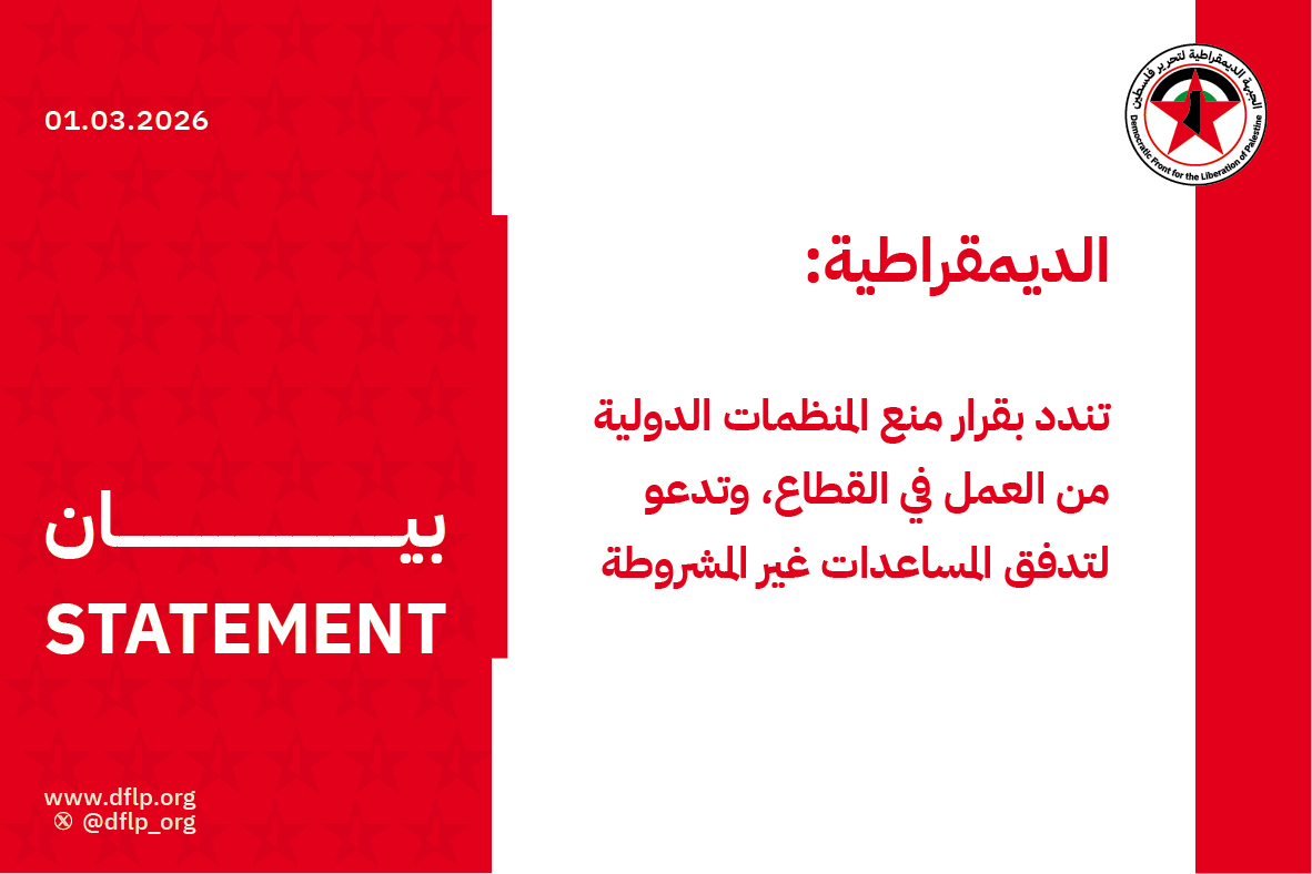 نددت الجبهة الديمقراطية لتحرير فلسطين بقرار دولة الفاشية الإسرائيلية، منع 37 منظمة دولية من تقديم خدماتها الإغاثية الإنسانية إلى شعبنا في قطاع غزة، وقالت: إنه قرار يعكس في سلوكه الطابع الفاشي الذي تتسم به سياسة الاحتلال الإسرائيلي في معاملة شعبنا في القطاع، وإصراره على فرض الحصار عليه، وحرمانه من ضرورات الحياة، الغذائية والصحية، ومواصلة حرب الإبادة بالأشكال المختلفة، من القتل إلى التجويع إلى الحرمان من العلاج، ظناً من عدونا أنه بذلك سينجح مرة أخرى في إرغام شعبنا على الهجرة، خاصة بعد أن تم فتح معبر رفح للعابرين.