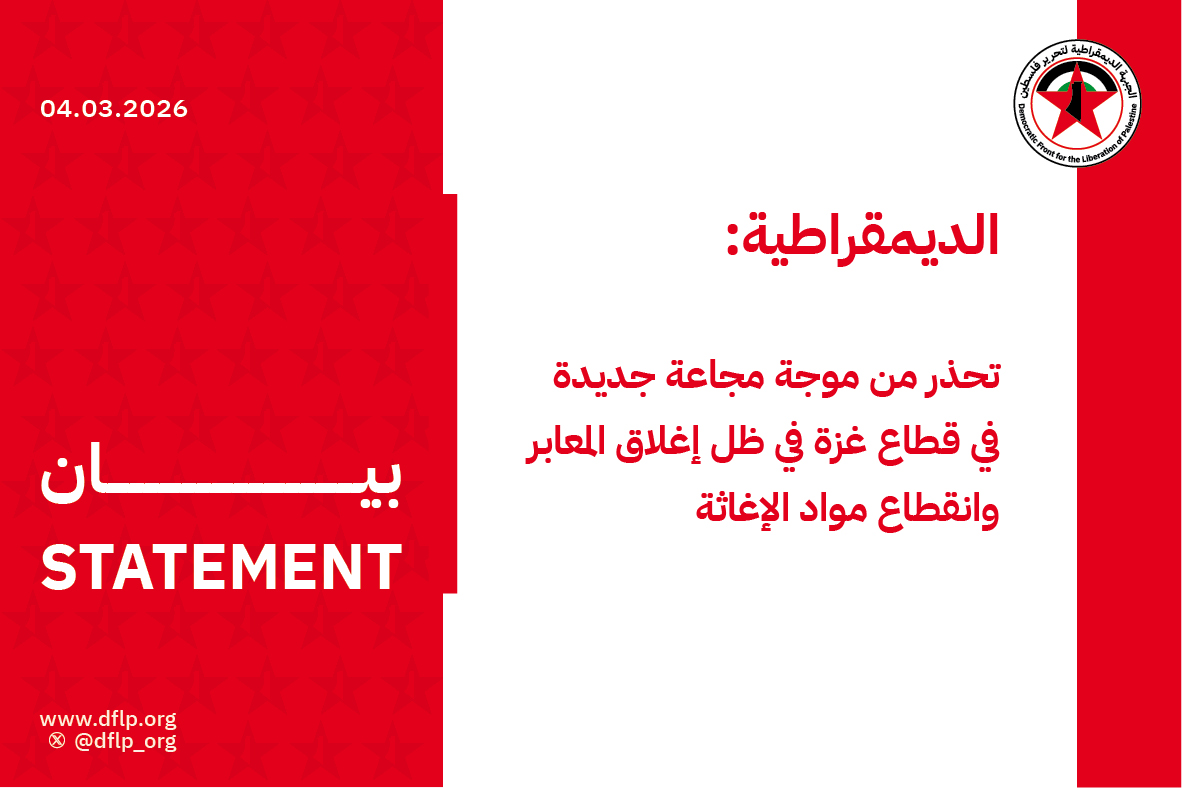 حذرت الجبهة الديمقراطية لتحرير فلسطين في بيان لها، من خطر حصول موجة مجاعة جديدة في قطاع غزة، في ظل إغلاق المعابر على يد الاحتلال الإسرائيلي منذ السبت الماضي في 28/2/2026.