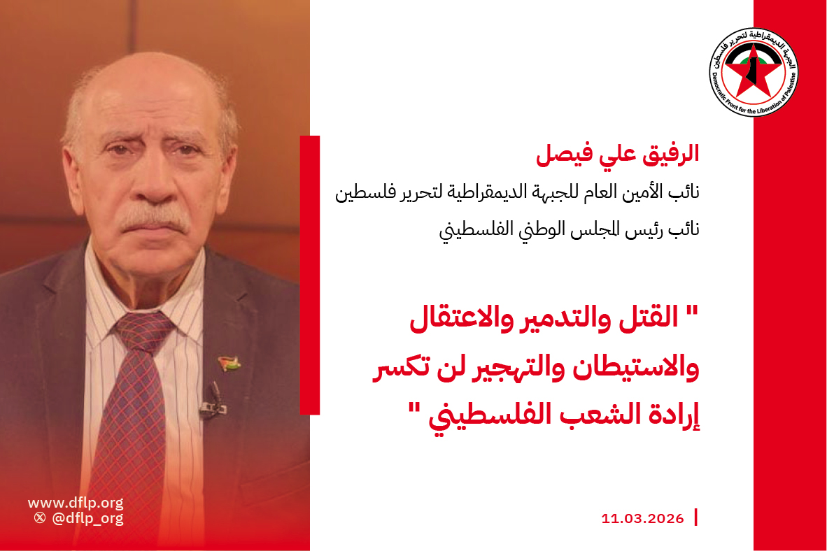 ندد الرفيق علي فيصل نائب رئيس المجلس الوطني الفلسطيني نائب الأمين العام للجبهة الديمقراطية لتحرير فلسطين في تصريح بالوحشية والفاشيه الإسرائيلية الممنهجه التي تُمارَس ضد شعبنا في الضفة الغربية على يد عتاة المستوطنين المتطرفين، بدعم ورعاية مباشرَين من حكومة نتنياهو، من خلال توسيع دائرة التسليح للمستوطنين لارتكاب مزيد من جرائم القتل والاعتقال بحق أبناء شعبنا، وزيادة عمليات الاستيطان بعد السماح باستملاك الأراضي وإلغاء القانون الأردني لتنظيم ملكيتها في الضفة الغربية.