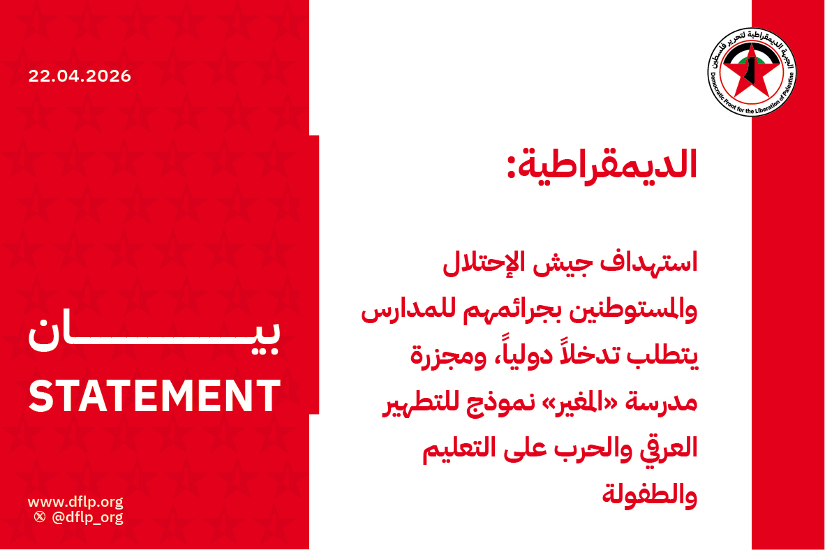 الديمقراطية: استهداف جيش الإحتلال والمستوطنين بجرائمهم للمدارس يتطلب تدخلاً دولياً، ومجزرة مدرسة «المغير» نموذج للتطهير العرقي والحرب على التعليم والطفولة