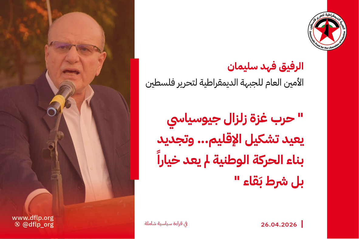 في قراءة سياسية شاملة، قدّم الرفيق فهد سليمان، الأمين العام للجبهة الديمقراطية لتحرير فلسطين، خلال جلسة نظّمها إقليم الفروع الخارجية للجبهة الديمقراطية، تشخيصاً مركّباً للحرب الجارية على غزة، وانعكاساتها الإقليمية، ومآلاتها المحتملة على القضية الفلسطينية، في لحظة وصفها بأنها من أكثر اللحظات التاريخية حساسية واضطراباً منذ عقود، وتضع المشروع الوطني الفلسطيني أمام اختبار وجودي مفتوح.