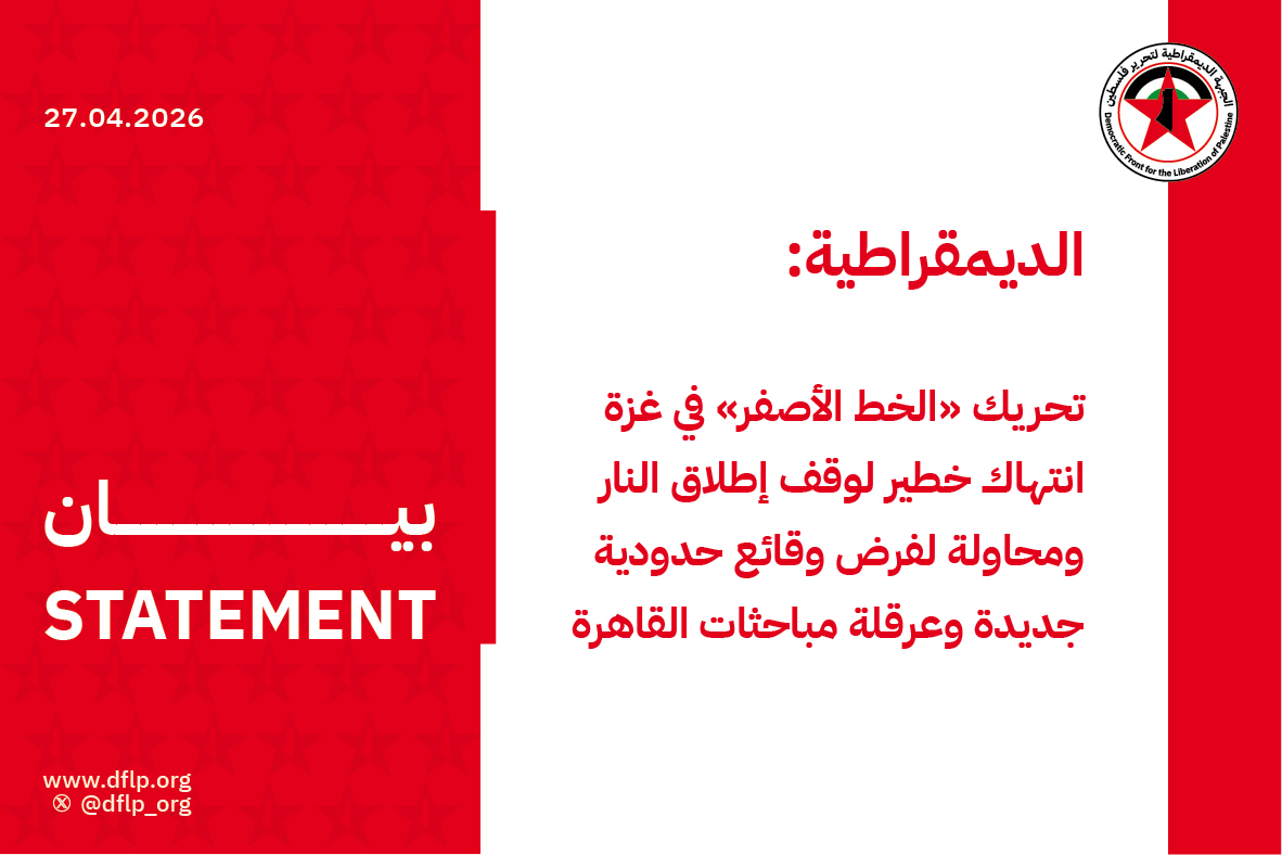 وحذرت الجبهة الديمقراطية من أن استمرار هذه السياسات يجري في ظل غياب ردع دولي فاعل، سواء من الإدارة الأميركية أو من الأطراف الدولية المعنية، رغم ما ورد في المبادرات الدولية ذات الصلة.