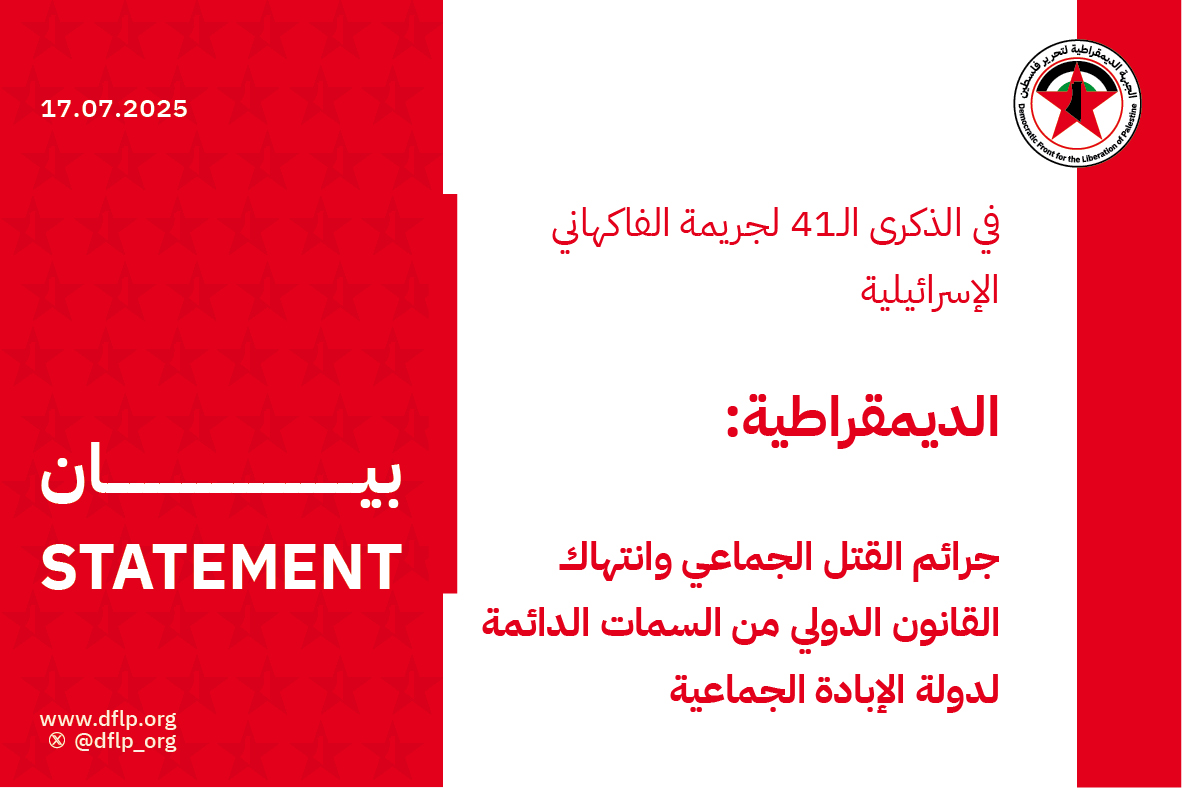 في الذكرى الـ41 لجريمة الفاكهاني التي ارتكبتها الطائرات الحربية الإسرائيلية في 17 تموز (يوليو) ضد حي الفاكهاني والمقرات المركزية للجبهة الديمقراطية لتحرير فلسطين.