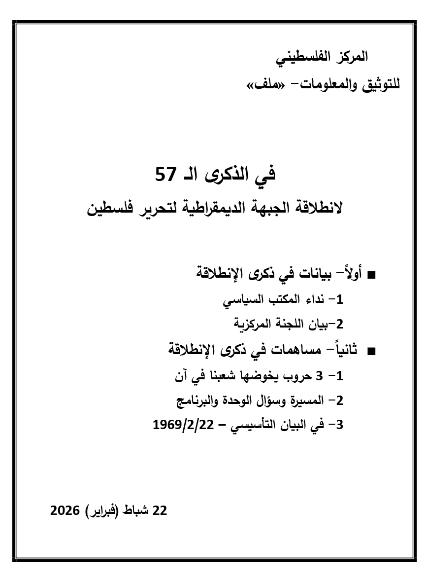 صدر عن المركز الفلسطيني للتوثيق والمعلومات «ملف»، في الذكرى الـ 57 لانطلاقة الجبهة الديمقراطية لتحرير فلسطين