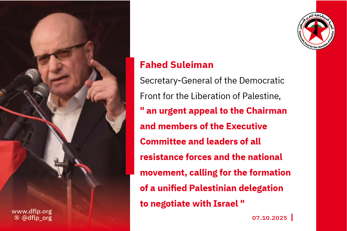 Fahed Suleiman, Secretary-General of the Democratic Front for the Liberation of Palestine, issued an urgent appeal to the Chairman and members of the Executive Committee and leaders of all resistance forces and the national movement, calling for the formation of a unified Palestinian delegation to negotiate with Israel.