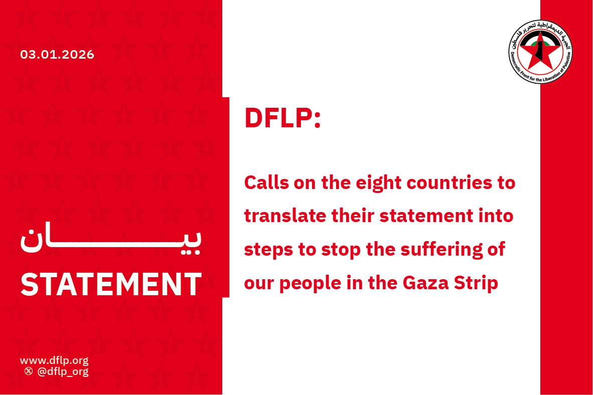 The Democratic Front for the Liberation of Palestine called on the eight Arab and Islamic countries that agreed to the Gaza agreement and the Trump plan to translate their positions, as stated in their recent statement, into practical steps that alleviate the suffering of all our people in the Gaza Strip.