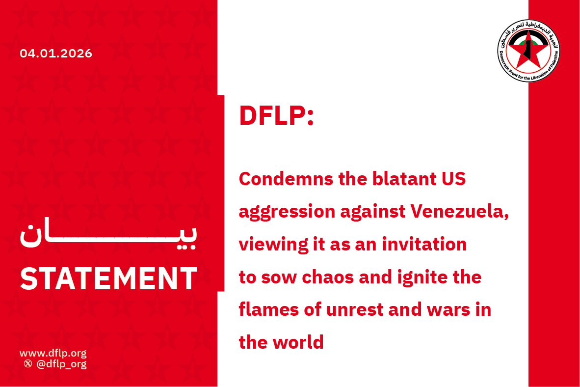 The Democratic Front for the Liberation of Palestine strongly condemned the blatant American aggression against Venezuela, and saw it as an invitation to sow chaos and ignite the flames of unrest and wars in the world, and to fire the coup de grâce at relations between peoples based on respect for the principles of international law, the sovereignty of peoples over their lands, and their right to self-determination.