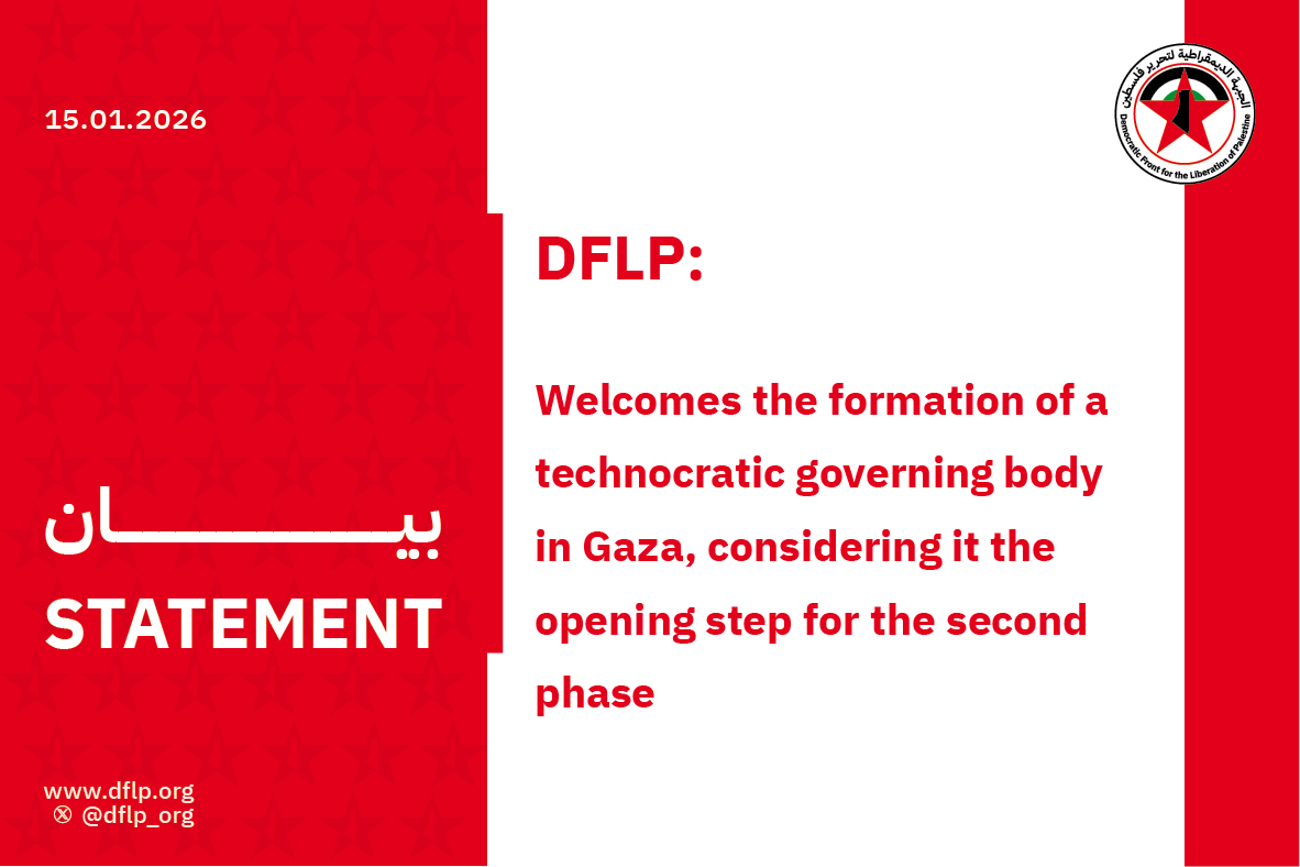 The Democratic Front for the Liberation of Palestine welcomed the announcement of the formation of a technocratic body to manage the Gaza Strip in the second phase of the Trump plan, considering it also as an announcement of the practical transition to the second phase, in order to end the Israeli occupation of what remains of the Gaza Strip, open the Rafah crossing, and allow unconditional aid into the Strip, including necessary shelter, to protect our people from the climatic fluctuations in the winter.