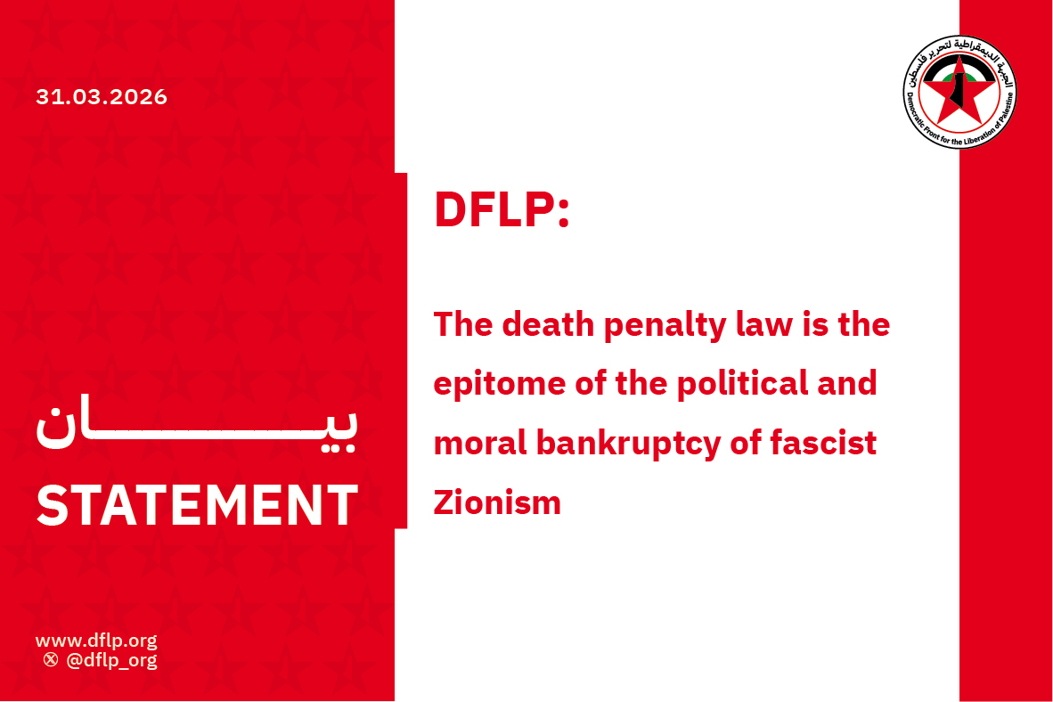 The Democratic Front for the Liberation of Palestine described the Israeli Knesset’s decision to give final approval to the law to execute Palestinian prisoners as the height of the political and moral bankruptcy of the Zionist state, and another step towards revealing its colonial essence, which resorts to the collective and individual extermination of our people as a means to achieve the project of the “Greater Aggression State,” at the expense of Arab land in Palestine, Lebanon and Syria.