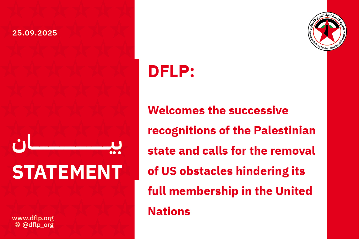 In a statement issued today, the Democratic Front for the Liberation of Palestine welcomed the successive international recognitions of an independent and fully sovereign Palestinian state, with its capital in Jerusalem, based on the 4 June 1967 borders. The statement said that these recognitions would strengthen the will and resolve of our people to continue their struggle and resistance in all its forms, until they achieve freedom and self-determination, establish their independent state, and realize it as a viable political entity, free from all forms of occupation, settlement, and any kind of tutelage, whether security-related, political, economic, or otherwise.